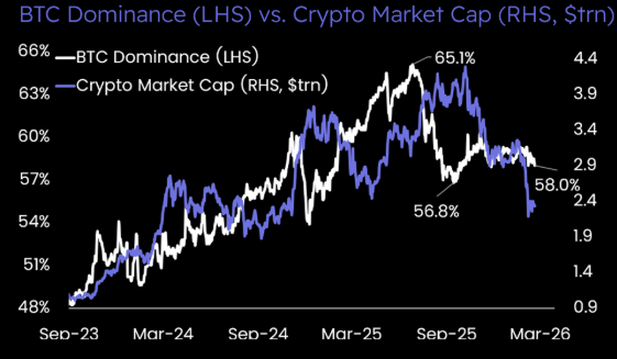 Meanwhile, Matrixport highlights that Bitcoin’s dominance is no longer rising, pointing to a paradigm shift in the crypto market. Bitcoin dominance is moving in line with the broader crypto market’s consolidation, bouncing to 58%.
